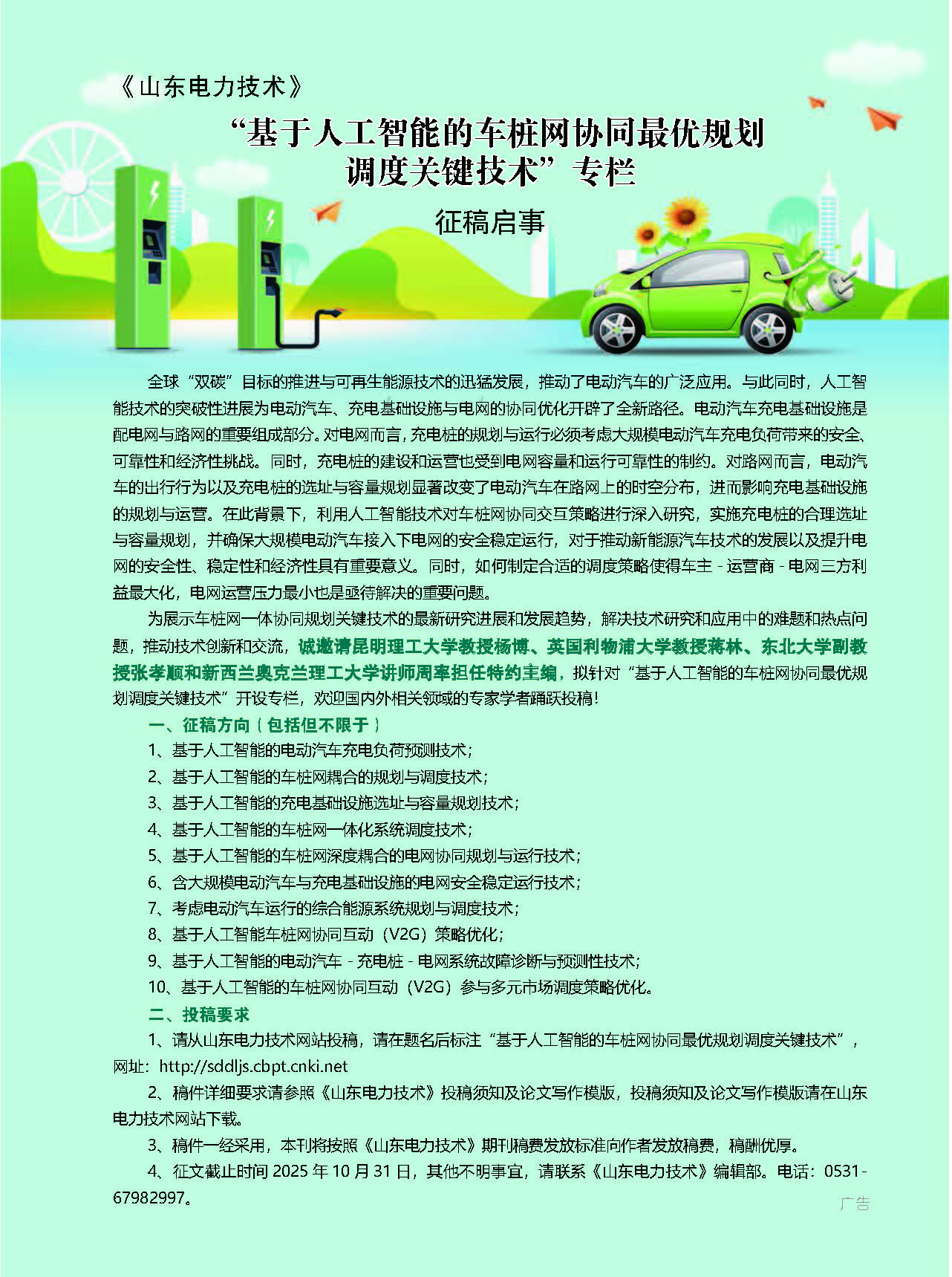 【征稿启事】“基于人工智能的车桩网协同最优规划专栏调度关键技术“专栏
